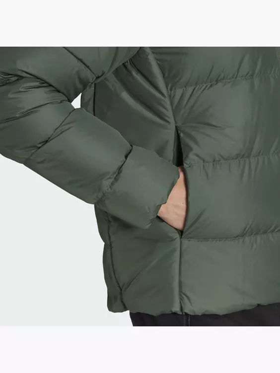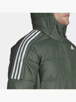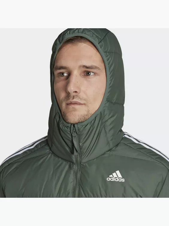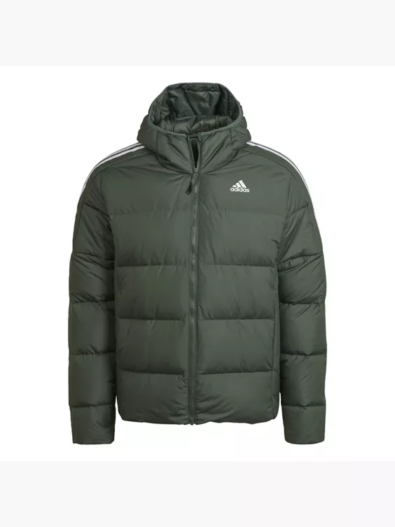 Mit dieser Essentials Midweight Hooded Daunenjacke geht es für dich funktional und stylish durch die kalte Jahreszeit.Ob Pendeln in der City oder ein langer Spaziergang durch die freie Natur – die Kombination aus verantwortungsvoll gewonnenen Entendaunen und dem Obermaterial aus recyceltem Polyester garantiert dir zuverlässigen Schutz vor Kälte. Außerdem sind die Bündchen, der Saum und die Einfassung an der Kapuze elastisch, damit die Wärme nicht entweichen kann. Für ein Plus an Schutz hält das wasserabweisende Finish leichten Regen ab.Das klassisch-minimalistische Design der Jacke passt zu allem, was dein Kleiderschrank zu bieten hat. Dank der legendären 3-Streifen und dem Logo-Detail kommt dabei natürlich auch der sportliche adidas Style nicht zu kurz.