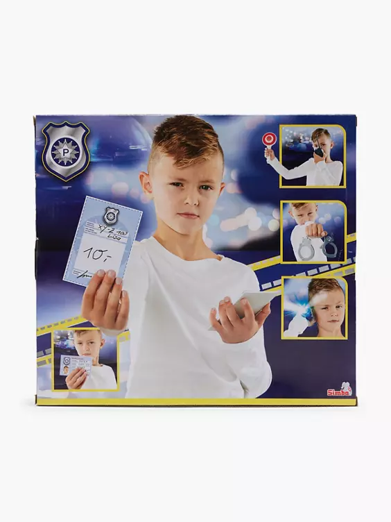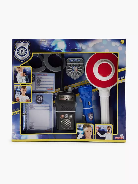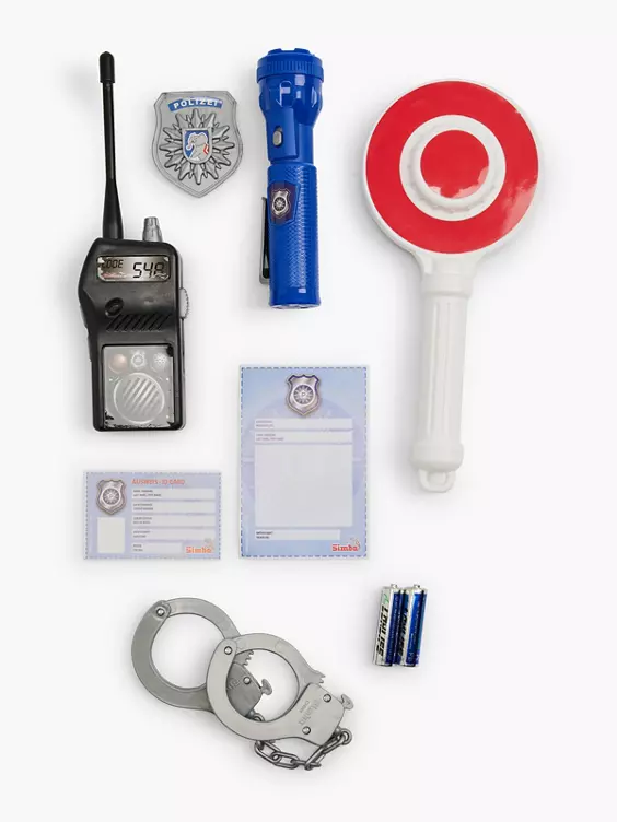 - Set bestehend aus 7 Teilen: Taschenlampe, Kelle, Handschellen, Polizeimarke, Strafzettel, Ausweis und Funkgerät